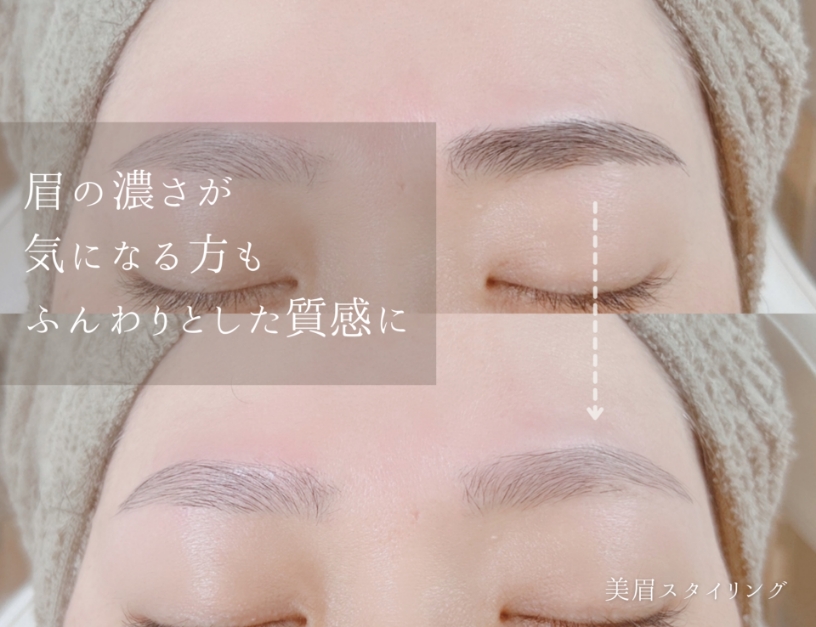 その後、眉全体のバランスを見ながら、濃さを調整するために毛量を間引き、ふんわりと自然な仕上がりに整えます。